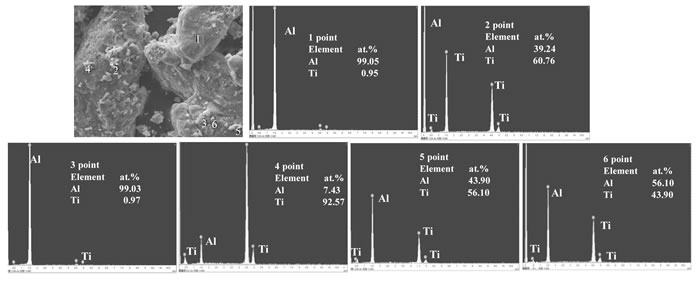 如圖8所示, 電解產(chǎn)品鈦鋁合金分布不均勻。在EDS圖中可以看出, 1、3點具有大顆粒形貌的是金屬鋁, 附著在大顆粒上的小顆粒2、4、5、6, EDS結(jié)果顯示成分為鈦鋁合金。由此推斷:恒壓電解過程中, 金屬鋁率先析出在金屬鉬陰極表面, 由于熔鹽電解過程溫度范圍是660~750℃, 所以金屬鋁以液態(tài)金屬的形式存在, 從而包裹在鉬電極表面形成新的陰極, 再與金屬鈦合金化在表面形成金屬鈦小顆粒。部分合金化的鈦鋁被液態(tài)的金屬鋁包裹, 形成圖中所顯示的大顆粒1、3。綜上所述恒壓電解可以得到鈦鋁合金產(chǎn)物, 但合金中存在鋁、鈦相, 需對陰極產(chǎn)物純化處理。