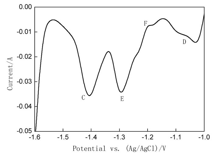 圖5所示, 750℃時, 在熔鹽體系中, 添加過量三氯化鋁, 以20 Hz的信號頻率, 金屬鉬作為工作電極, 進行方波伏安測試。曲線中-1.4V的陰極電流信號C對應(yīng)于金屬鈦的沉積, 與上述循環(huán)伏安結(jié)果相符。在圖中-1.04、-1.3、-1.15 V的3個信號峰與循環(huán)伏安結(jié)果相符。C、E、D三個尖銳峰形狀與固相生成峰形狀相似, 與鈦、鋁、鈦鋁合金標準電位具有微弱的偏差。在-1.15 V處所出現(xiàn)的小峰F, 與鈦鋁合金在鉬電極上欠電位沉積有關(guān)。據(jù)文獻報道[13-15], Ti (Ⅱ) 離子還原為金屬Ti的電位比Al (Ⅲ) 離子在熔鹽中的還原電位負。在含有Al (Ⅲ) 離子的熔鹽中, Ti (Ⅱ) 的沉積電位要正于Al (Ⅲ) 離子的沉積電位, 這是由于欠電位沉積 (UPD) 引起。