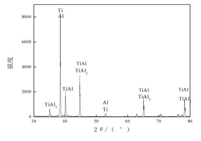 電解質(zhì)體系中, 使用恒電位方法, 以金屬鉬為工作電極, 電解制取鈦鋁金屬間化合物。由于試驗條件所限, 陰極生成的合金易進入熔鹽底部。因此對電解產(chǎn)物的表征, 是3 h電解試驗后, 3%的稀鹽酸浸泡熔鹽, 所用鹽酸濃度較高, 防止電解質(zhì)中存在的低價鈦氧化生成二氧化鈦, 第一步將熔鹽全部溶解后, 再使用0.5%的鹽酸進行過濾、淋洗, 所得產(chǎn)物, 真空烘箱中60℃條件下干燥4 h進行XRD分析。圖7是750℃條件下, -1.3 V恒電位電解3h, 所得產(chǎn)物的XRD圖譜。表明電解產(chǎn)物中, 存在純金屬鈦、金屬鋁和、金屬間化合物。