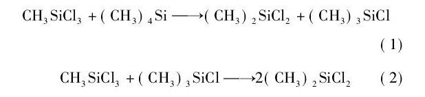 有機硅低沸物的歧化, 主要是利用M1與Me4Si在一定溫度條件、催化劑存在下發(fā)生基團轉換反應, 生成M2和三甲基一氯硅烷 (M3) , 原料中的MH、M2H能夠對歧化反應起促進作用。