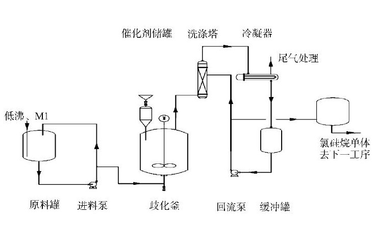 有機硅低沸物的歧化流程如圖1所示。低沸物、M1混合后經進料泵送入歧化釜與催化劑三氯化鋁進行反應, 生成的氯硅烷單體通過洗滌塔洗滌后進行冷凝, 冷凝液一部分作為洗滌液對氯硅烷單體進行洗滌, 另一部分作為產品進入氯硅烷單體罐。