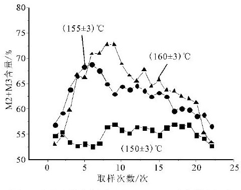 由圖3可見, 當溫度控制在 (150±3) ℃時, 由于反應溫度偏低, 不能為甲基、氯的重排提供足夠能量, 使得周期內M2+M3的含量明顯偏低, 平均值為55.05%, 最大值為56.81%;而隨著溫度的升高, 周期內M2+M3的含量明顯增加, 當溫度控制在 (160±3) ℃時, 周期M2+M3含量的平均值提高到64.01%, 最大值為72.74%。